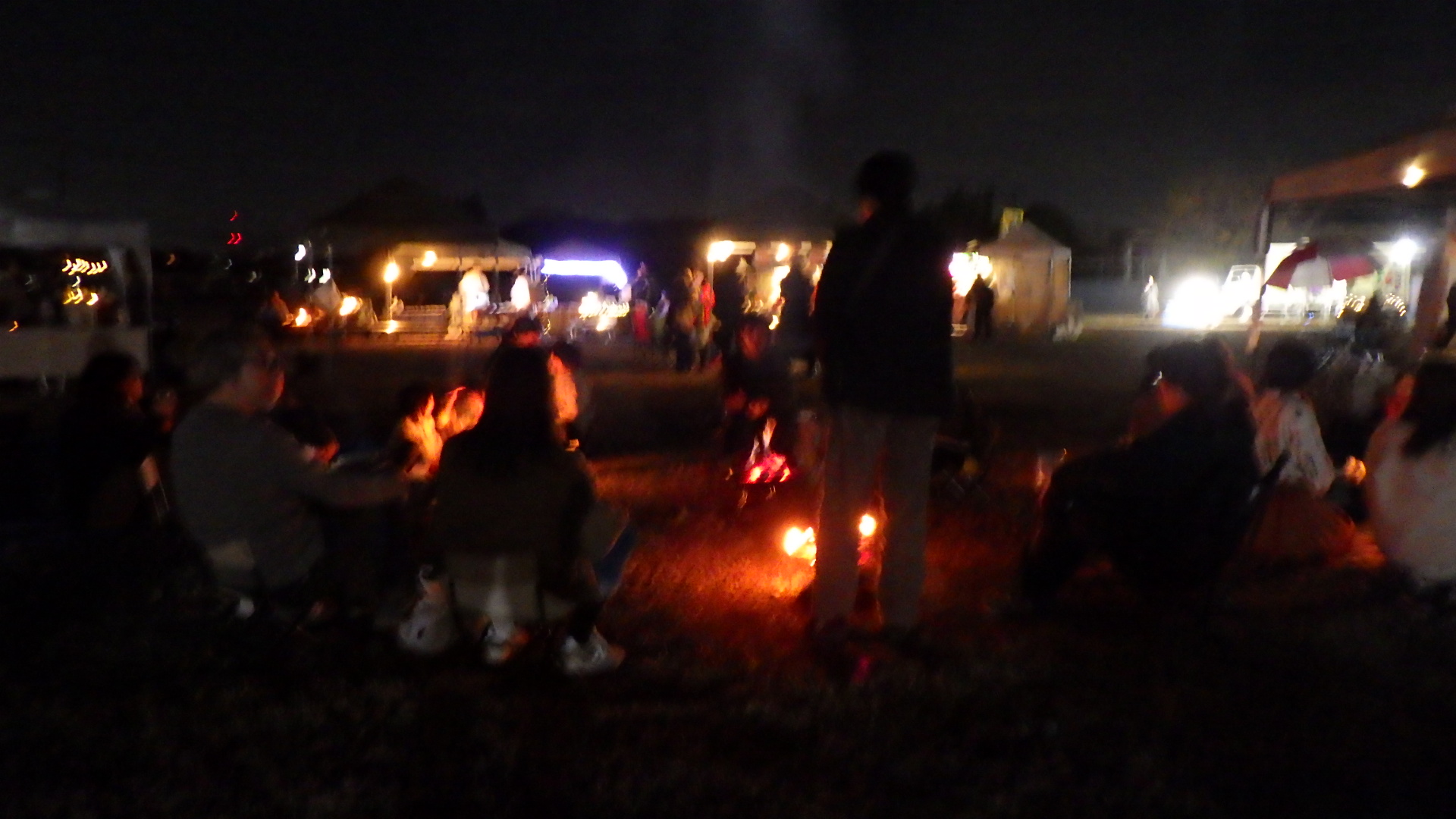 焚火を囲んでの交流や、キッチンカーによる美味しいグルメ、プレイパーク、音楽ライブ、地元農産物の販売やフリーマーケット、ワークショップや日本酒の飲み比べコーナーなど、多彩な催しが並びました。