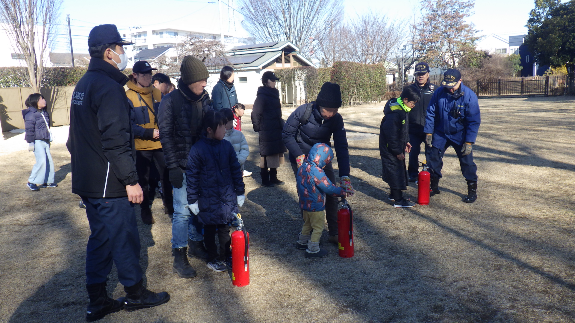 まずは初期消火訓練。消火器の構え方、ピンの抜き方、ハンドルを握る正しいタイミングなどについて小川分署の方に解説をしてもらい、いざ実践。
