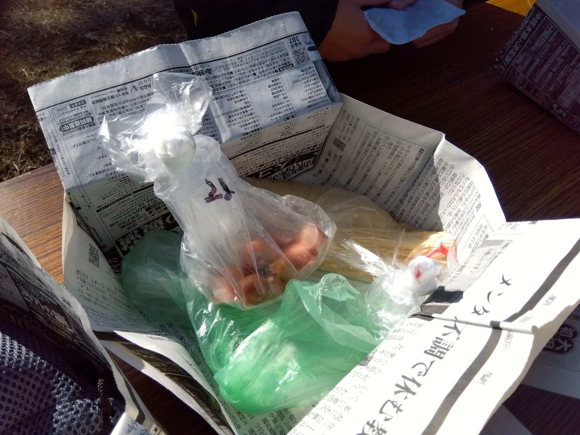 ポリ袋にパスタ(乾麺)と水を入れ、受付のかごの中に並べておきました。