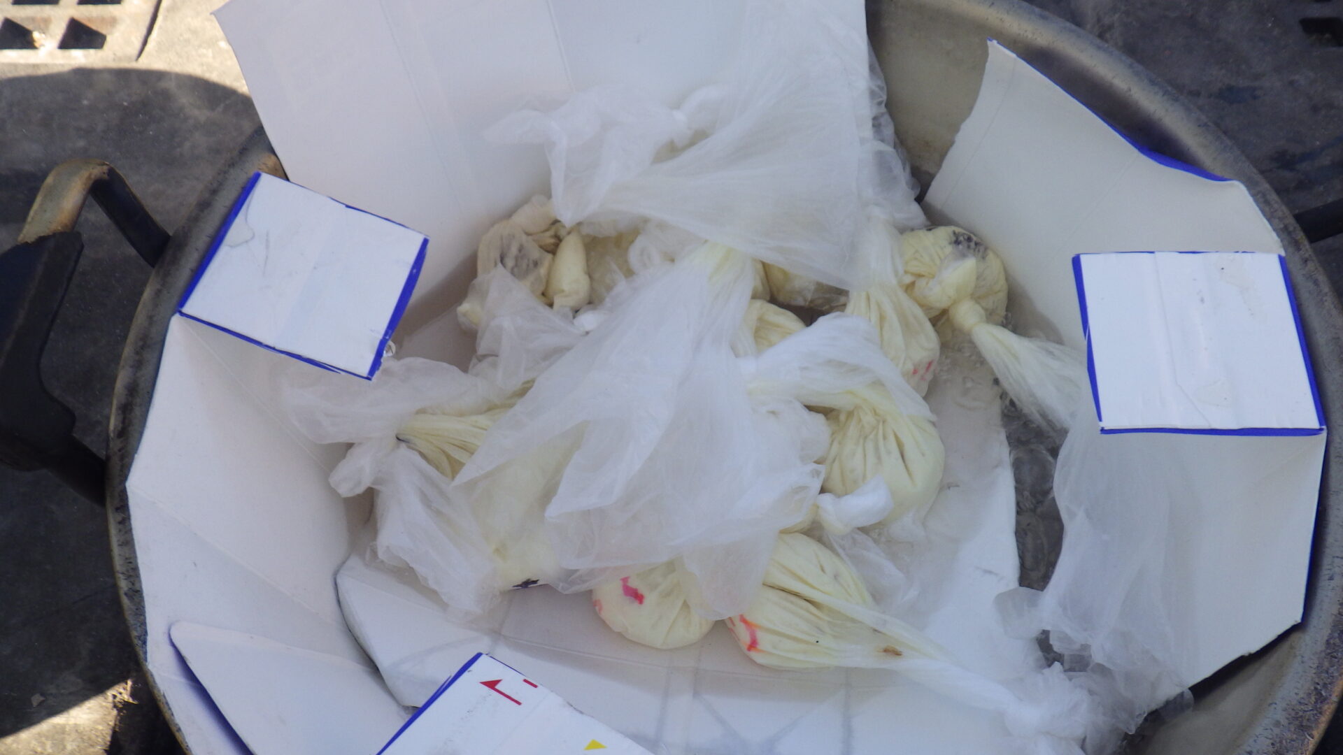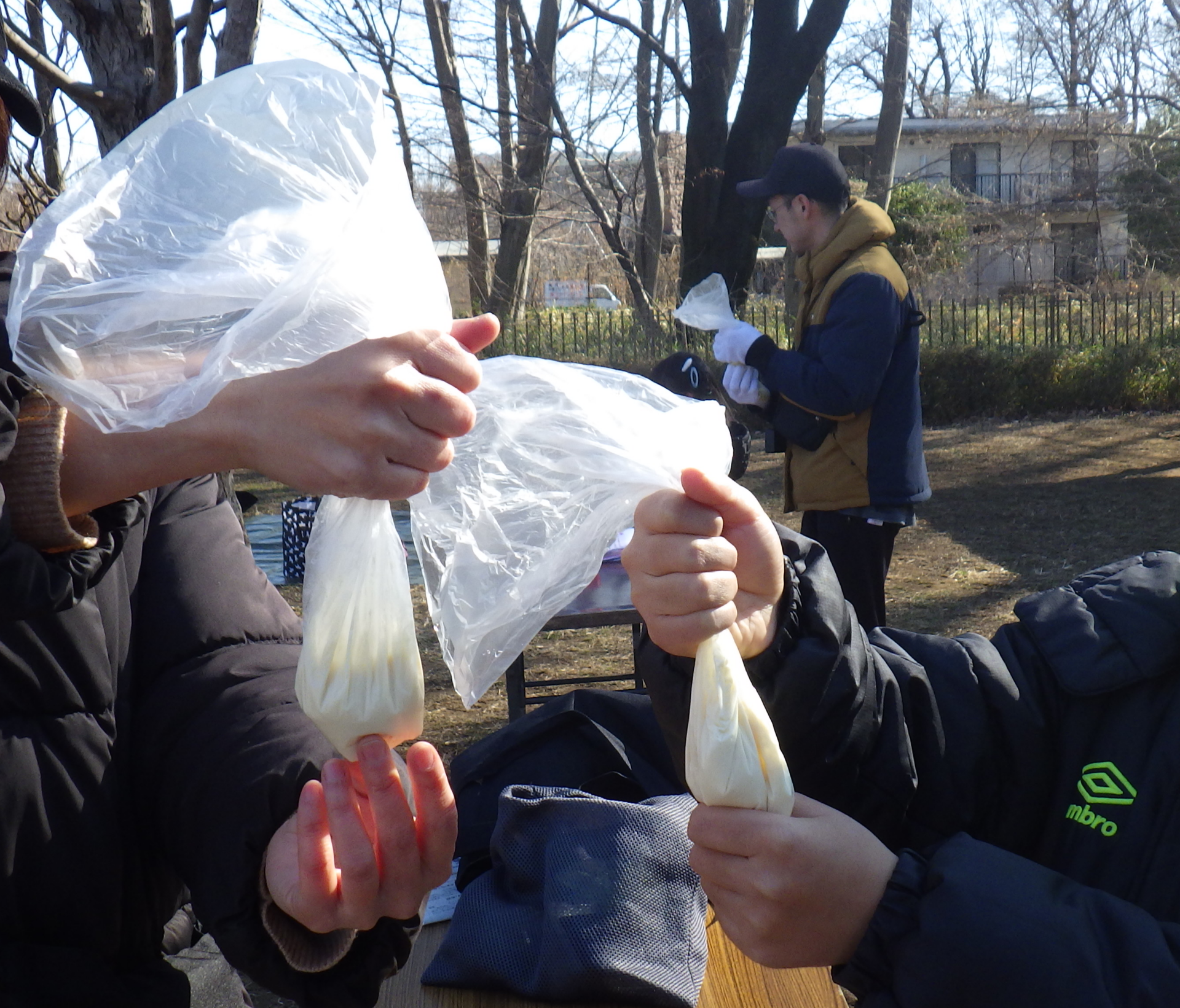 湯煎調理が可能なポリ袋に材料を入れてこね、蒸しパンの生地作り。