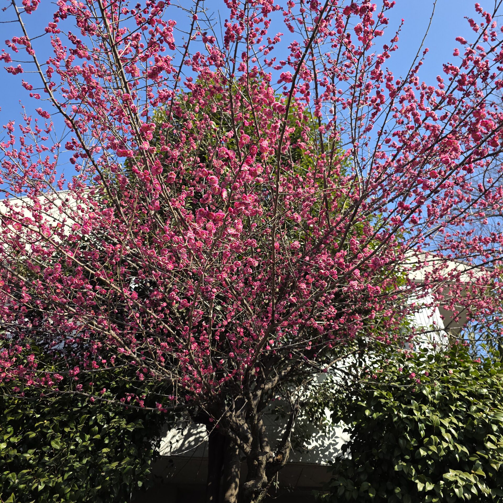 建物北側。存在感たっぷりの見事な紅梅です。