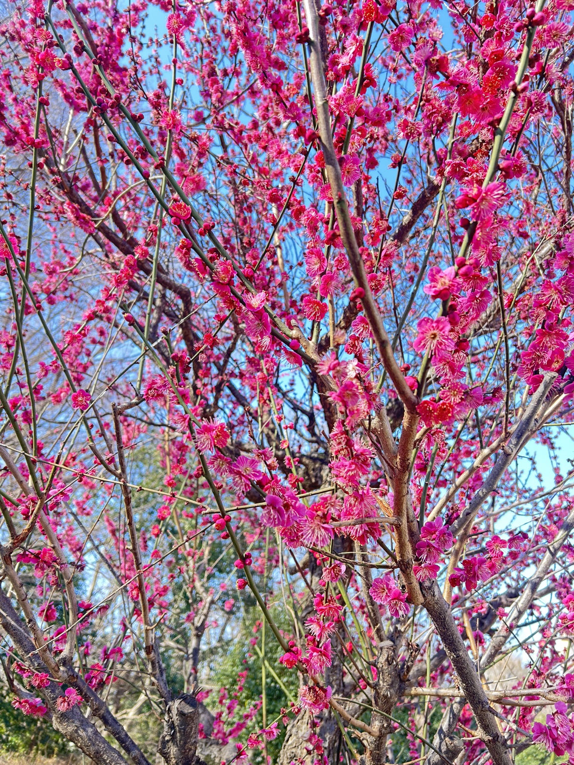 公園中央の紅梅。澄んだ空に鮮やかな紅色がよく映えます。