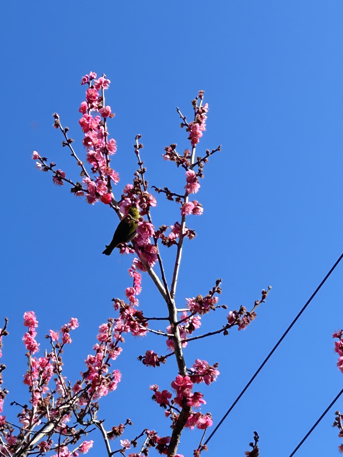 メジロが蜜を啄みに。4本の梅と紅梅が一斉に咲く景色は圧巻です。