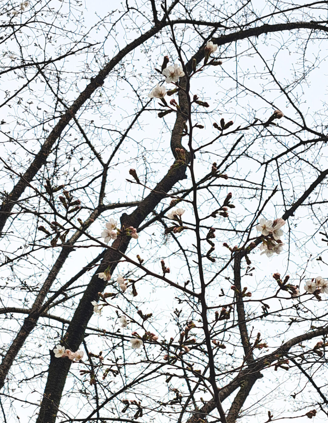枝の先にちらほらと、ほころび始めた桜が見えます。