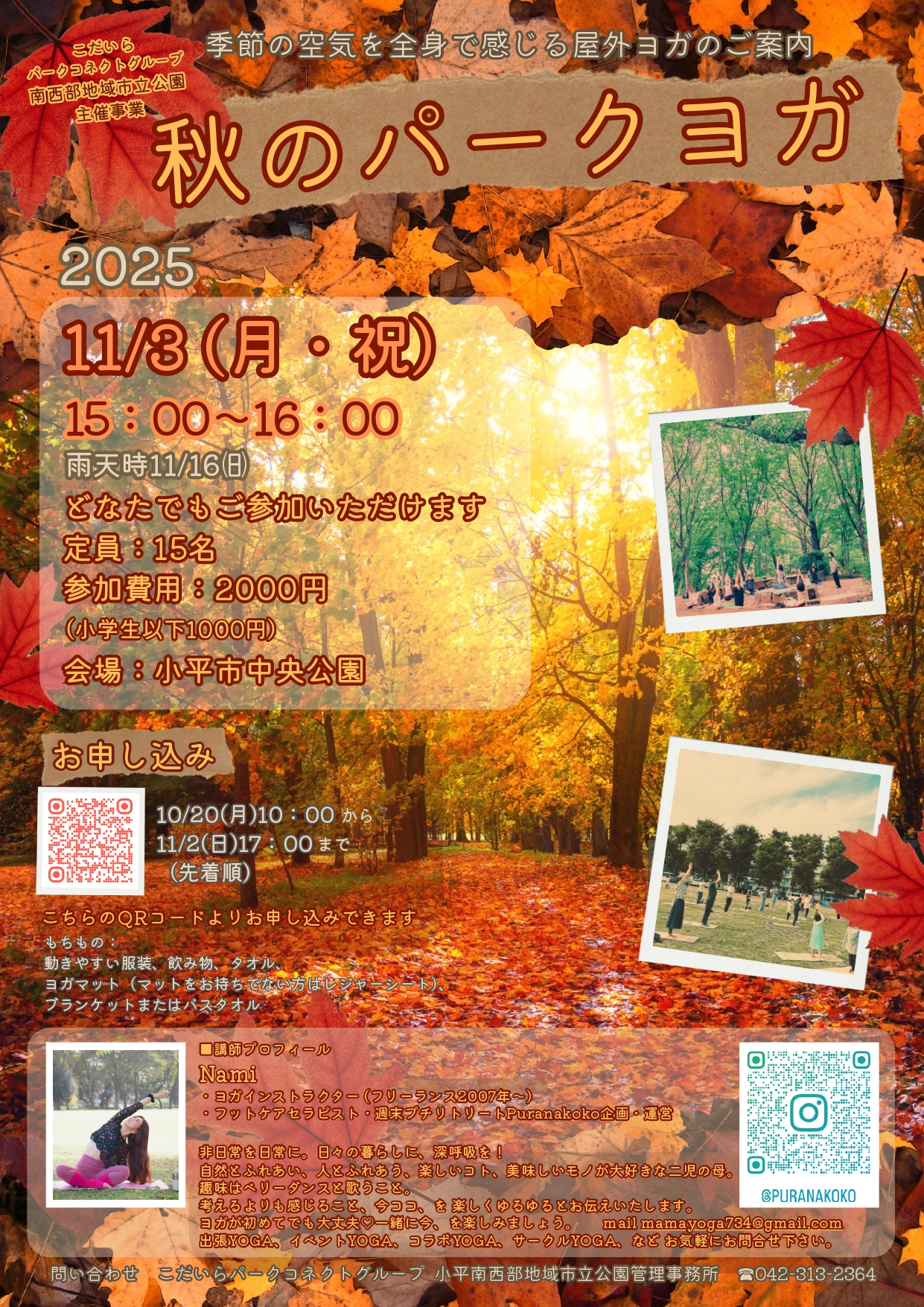 小平市在住のヨガインストラクターNamiさんを講師にお招きして、秋の爽やかな空気を感じながらヨガをします。