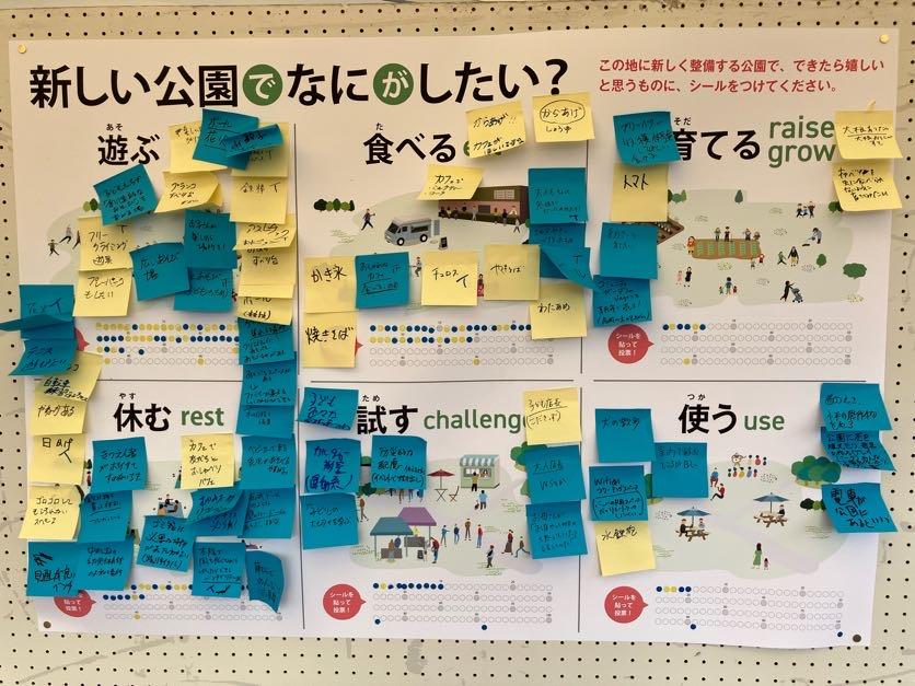 アンケートでは、新しく整備する公園で、できたら嬉しいと思うジャンルにシールを貼ってもらい、150個のシールが集まりました。また、選んだジャンルで具体的にやりたいことがある方には、その内容を付箋に書いてもらいました。